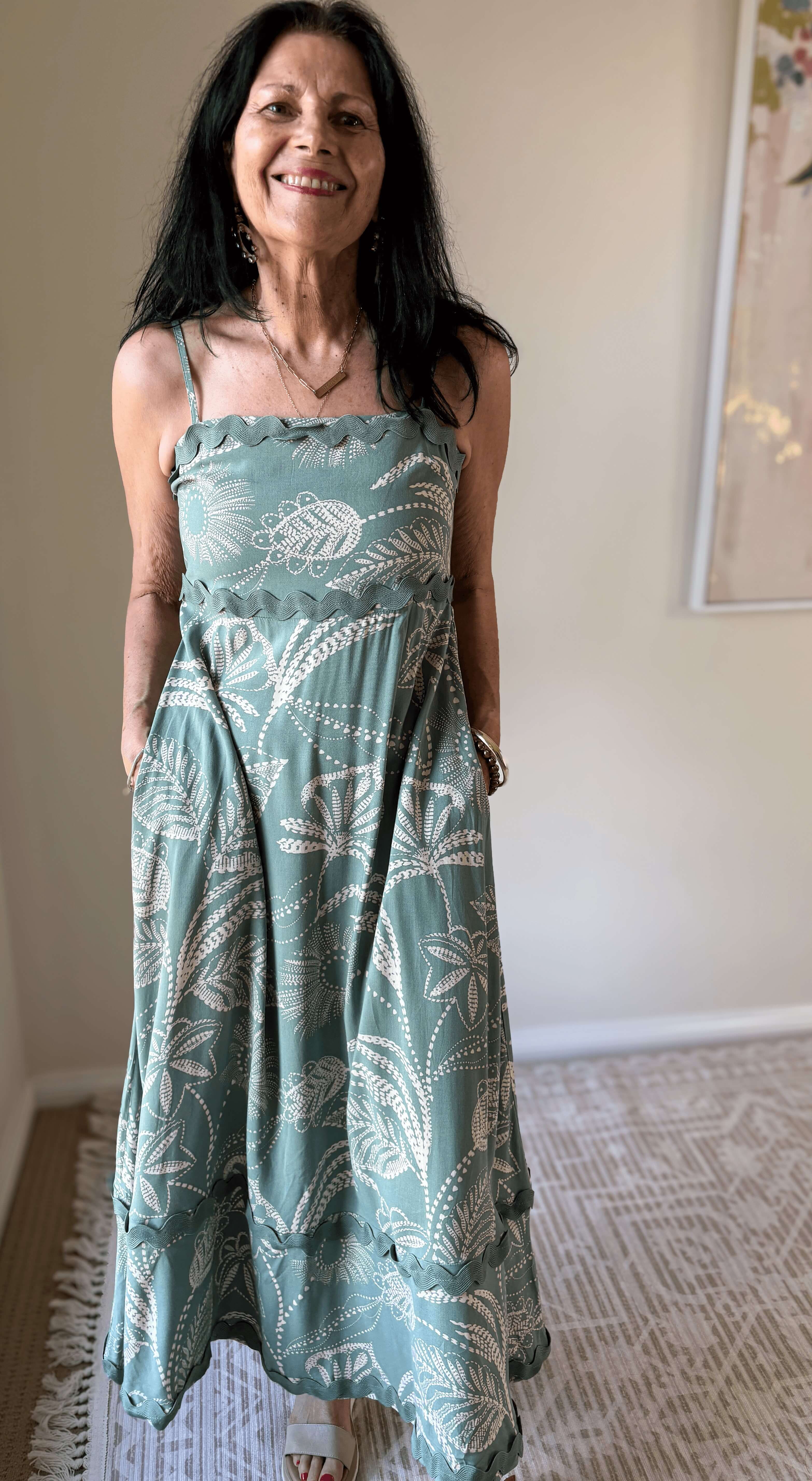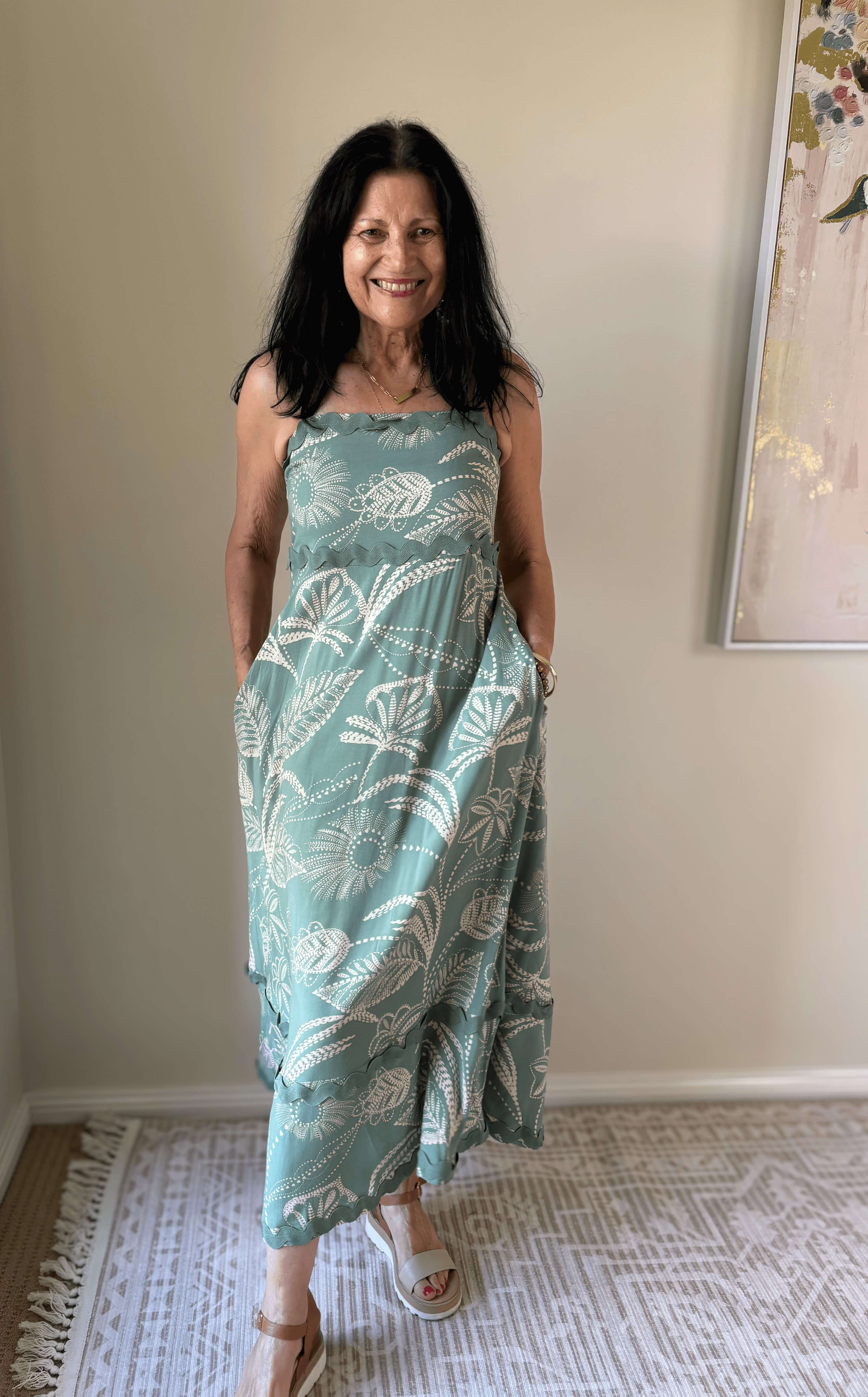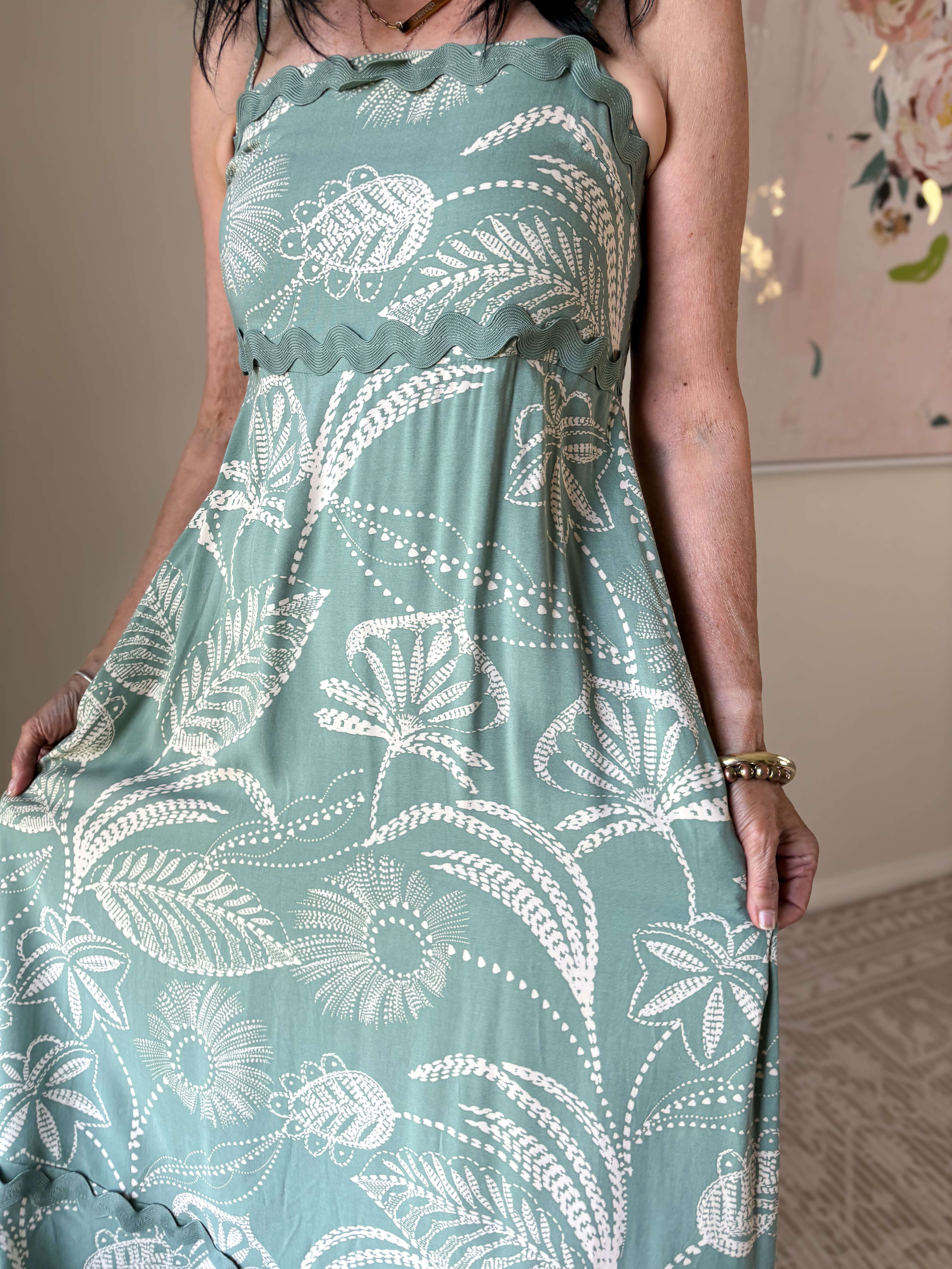 Show off your fun and playful side with our Phoenix Midi Dress! Enjoy the green with cream floral print design and irresistibly soft fabric. Enjoy adjustable comfort with the spaghetti shoulder straps and shirred bodice at the back. Featuring the on trend Ric Rac design, this is a "chuck on and go" effortless dress, perfect for adding a playful touch to your wardrobe.