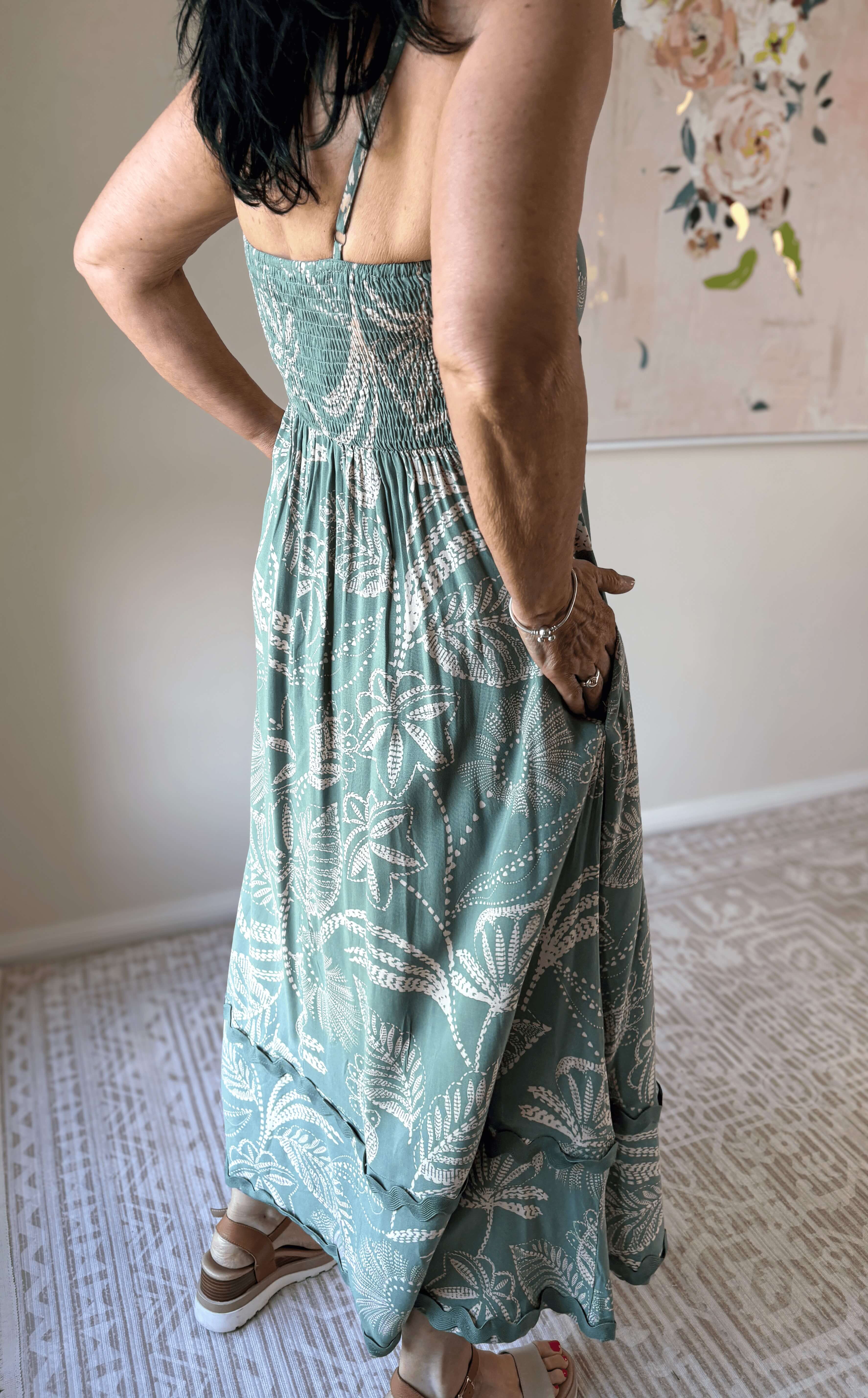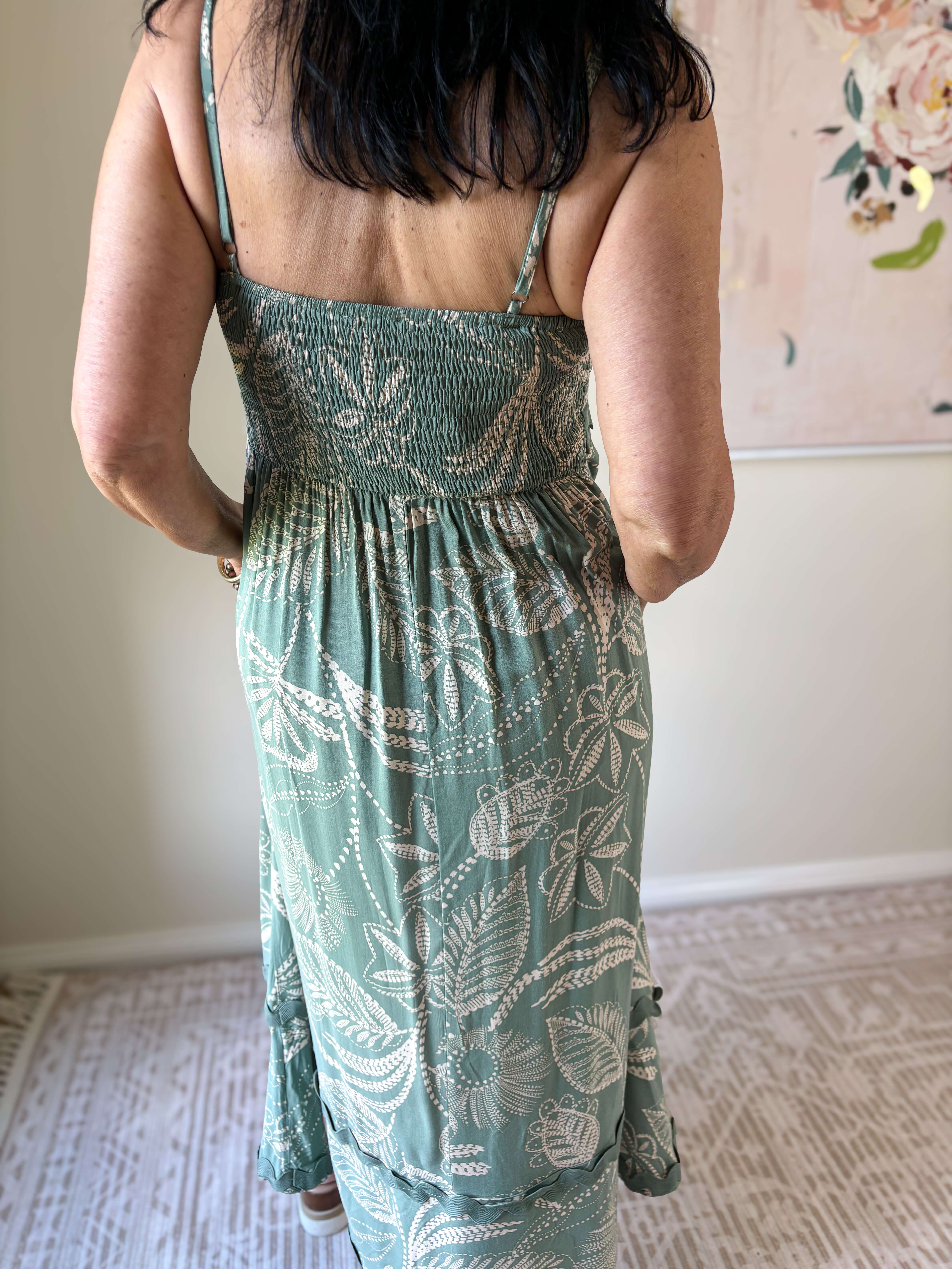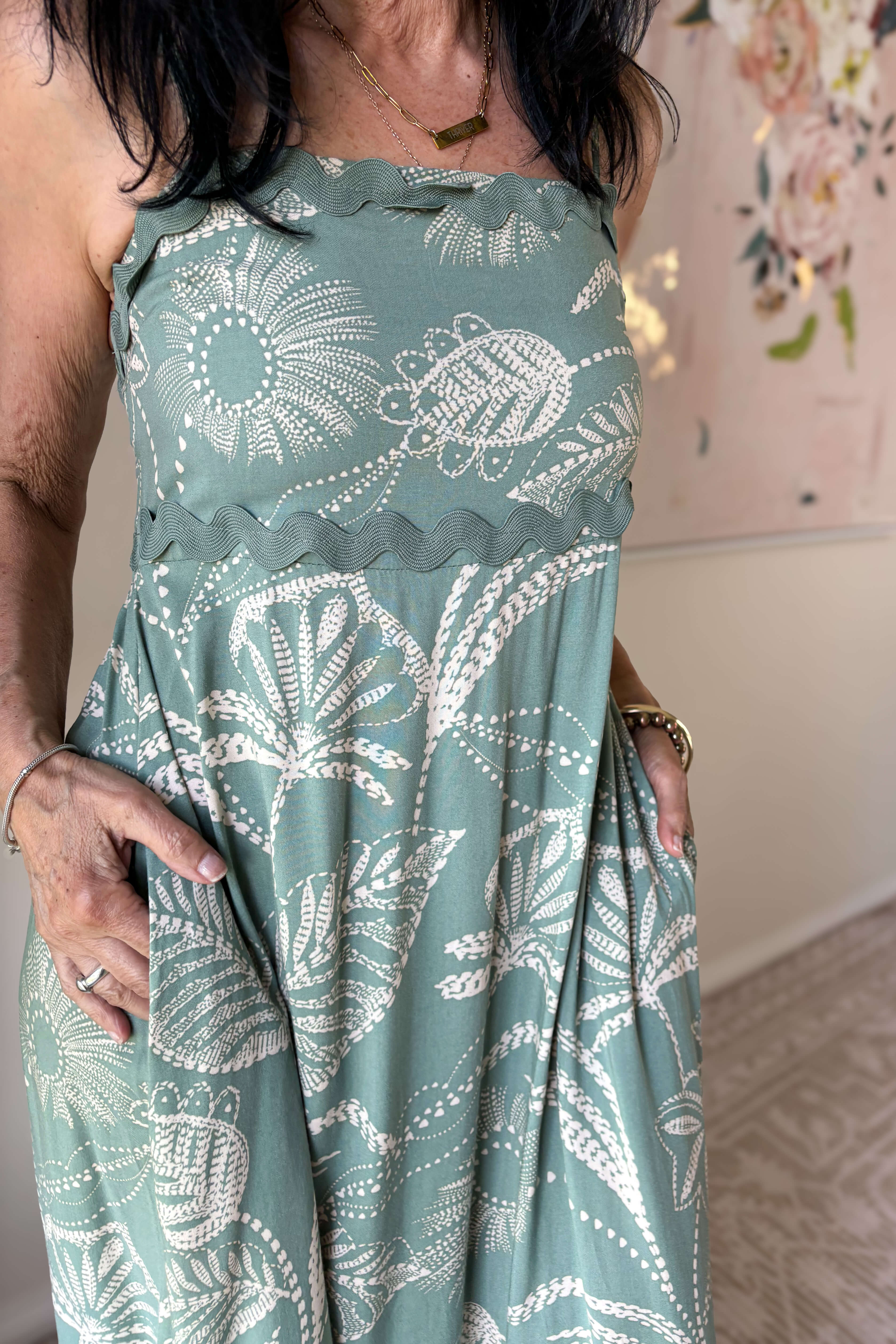 Show off your fun and playful side with our Phoenix Midi Dress! Enjoy the green with cream floral print design and irresistibly soft fabric. Enjoy adjustable comfort with the spaghetti shoulder straps and shirred bodice at the back. Featuring the on trend Ric Rac design, this is a "chuck on and go" effortless dress, perfect for adding a playful touch to your wardrobe.