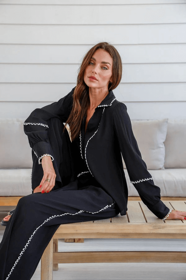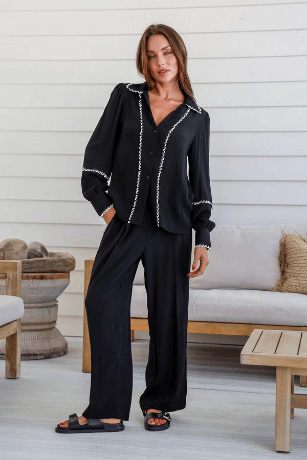 The Allie Pant is lightweight, full length pant, featuring a modern detail feature of white eyelets down the leg to add a touch of sophistication. With convenient side pockets, this pant is both stylish and practical!