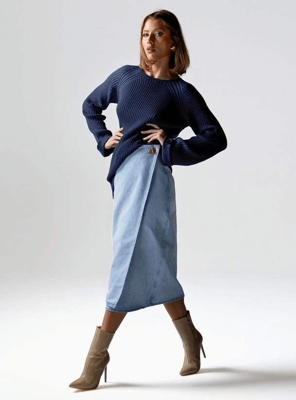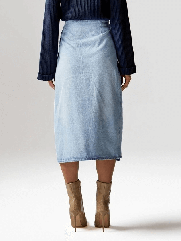 Elevate your denim game with the Flight Denim Wrap Skirt by Fate + Becker, a timeless blend of chic sophistication and casual cool. Designed for effortless wear, this wrap-style silhouette flatters every shape, creating a sleek and feminine look with just the right amount of edge. The ultimate denim skirt eluding elegance and style. Featuring a touch of sophistication with the gold closure detail, midi length and rigid denim fabric.