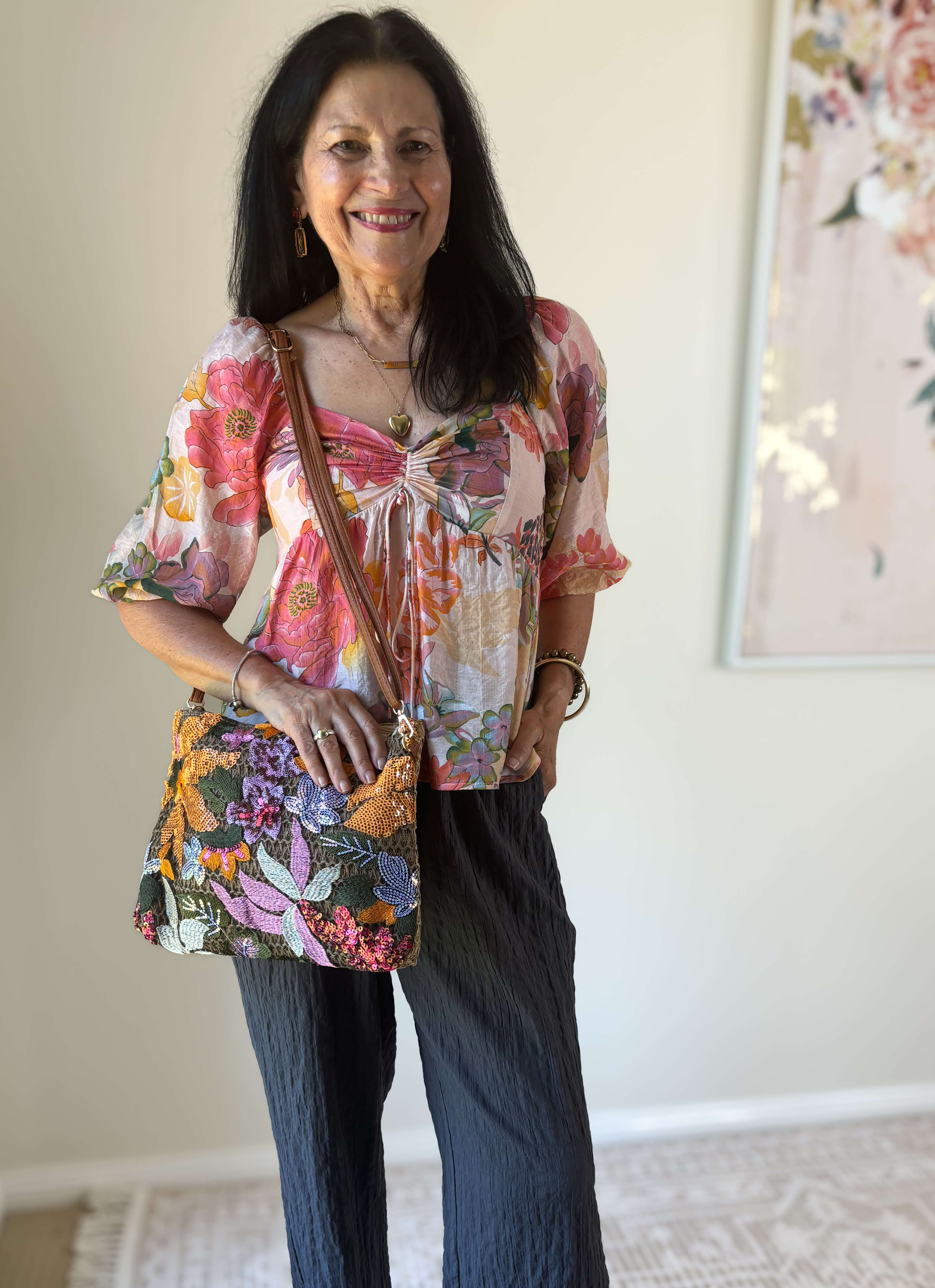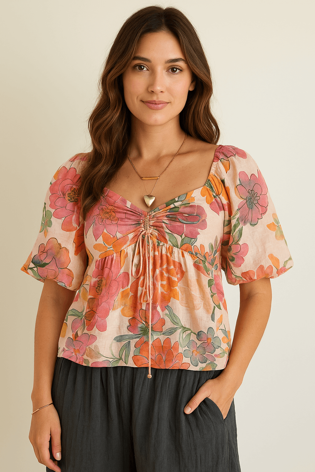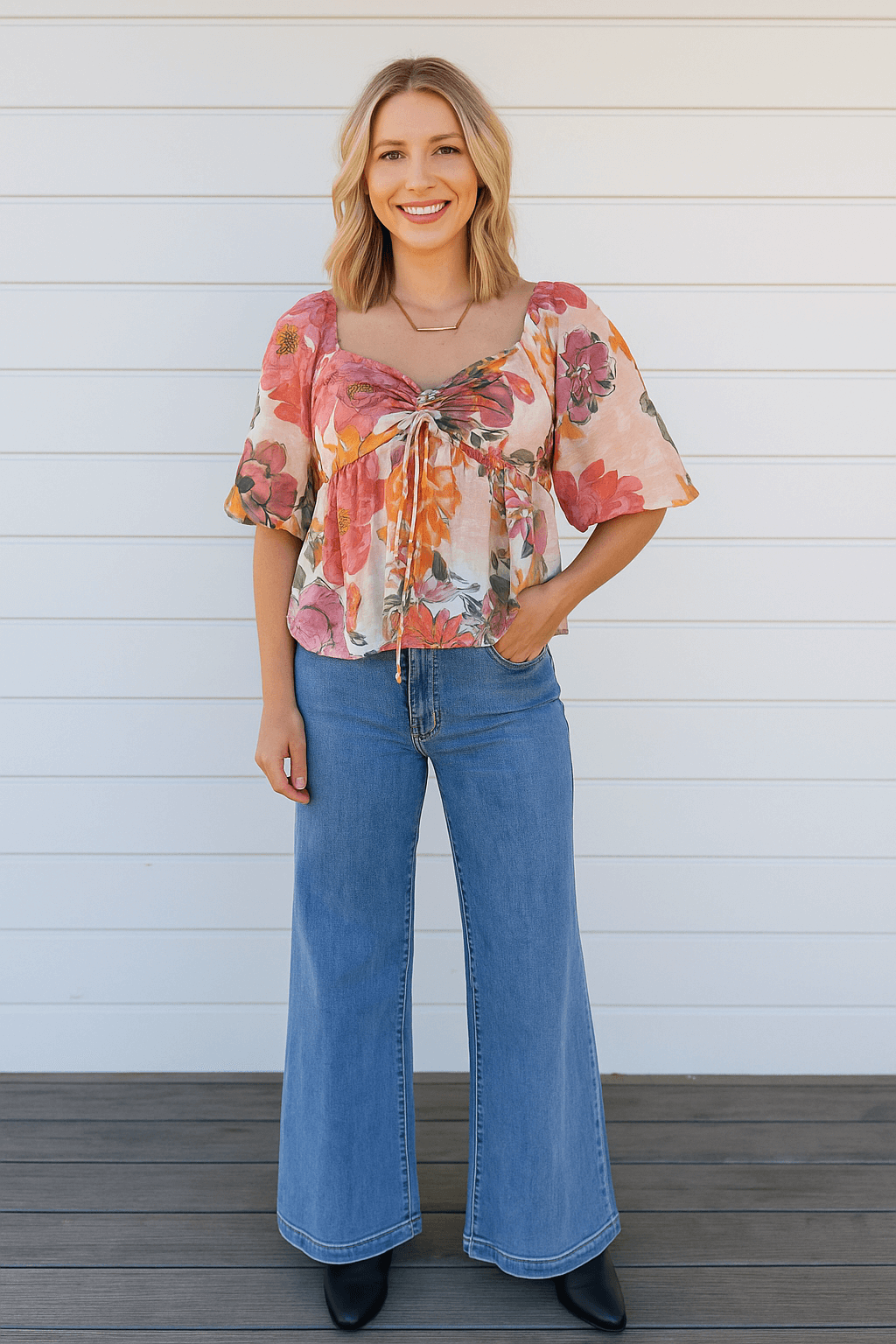 Introducing the Peach Floral Sweetheart Top. Add a touch of soft, feminine elegance to your wardrobe! Featuring a sweetheart neckline, soft, bouncy puff sleeves, that can be worn on or off the shoulder, a stunning floral print and an incredible soft, delicate fabric to make you feel like a queen. Have all eyes on you with this conversation starter piece!