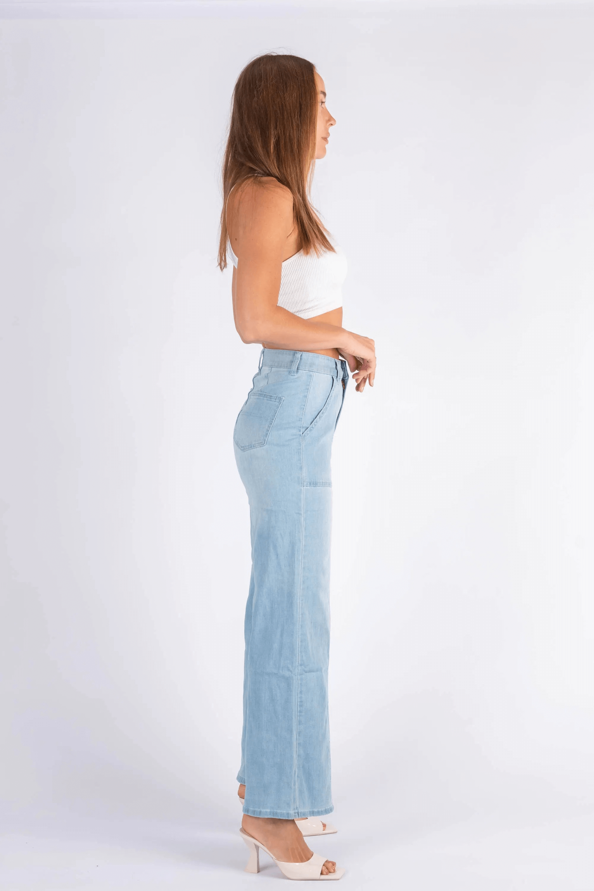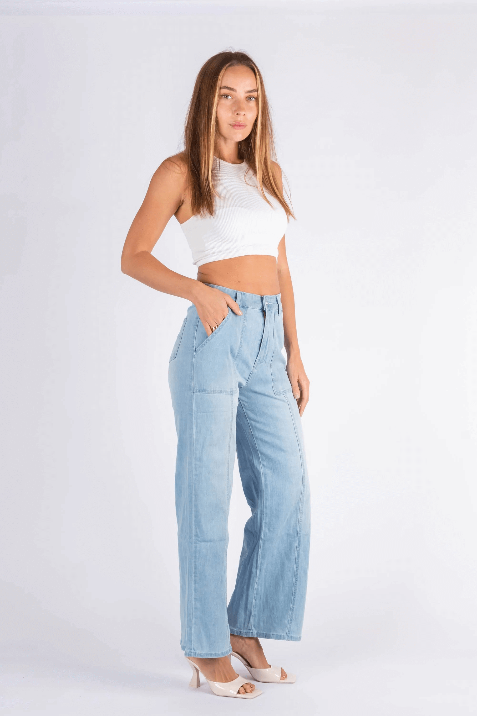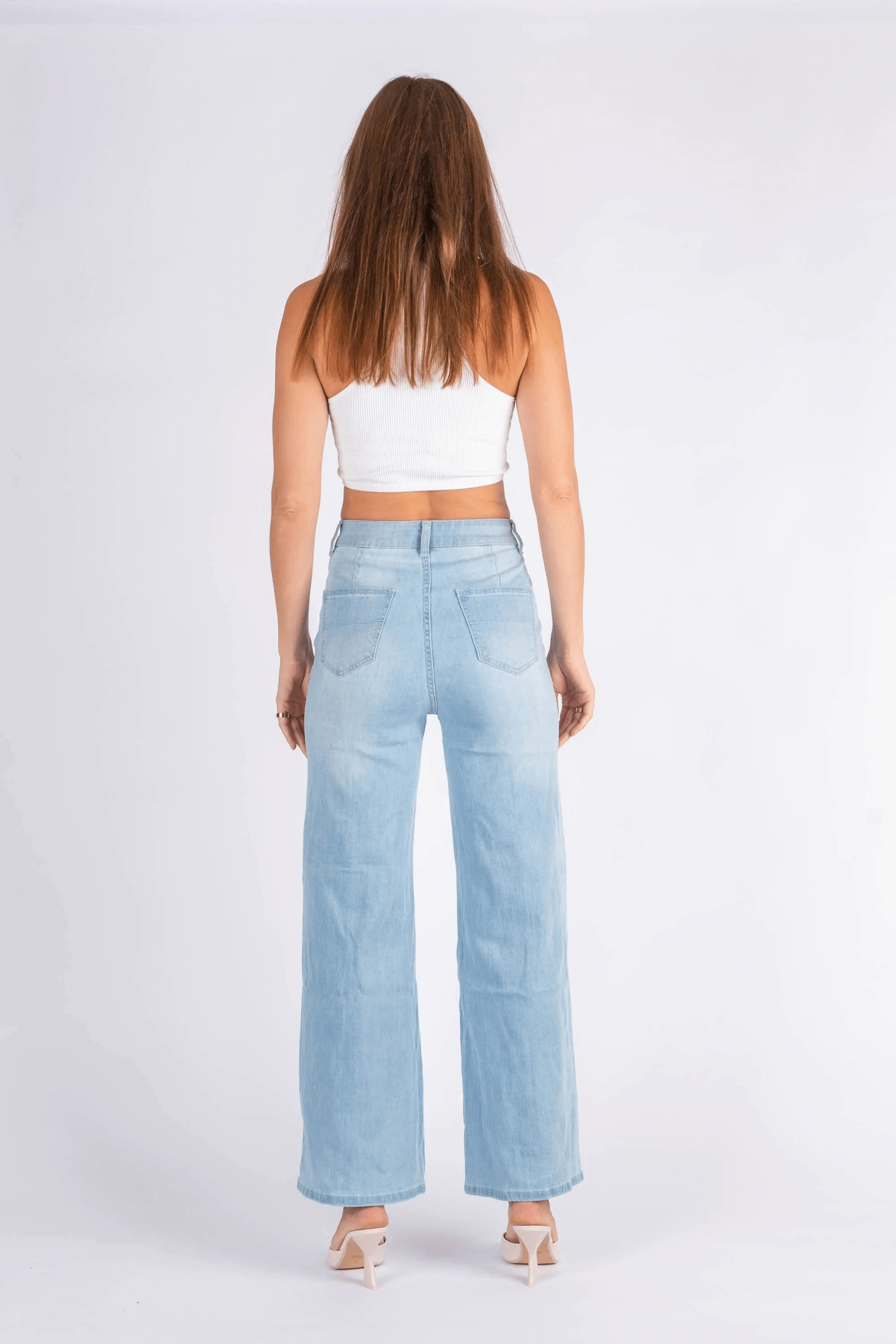 Featuring a high rise fit and wide leg style, these light blue beauties hug your curves while keeping you comfortable all day. With a design that screams cool, you'll never want to take them off! (Only available in denim, not made of clouds)