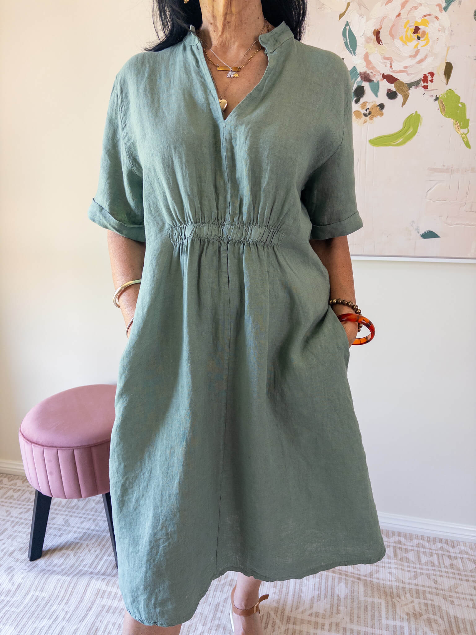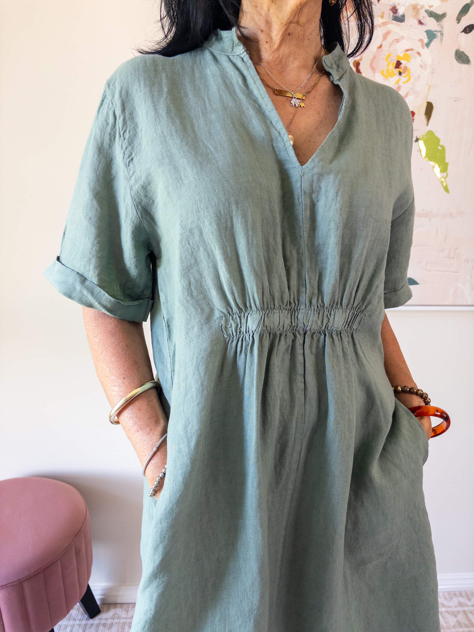 Featuring a v-neckline and gathered, elastic waist detail, this is the perfect chuck-on and go dress - great for those last minute invitations. Made from lightweight breathable linen, this dress is perfect for the warmer weather.