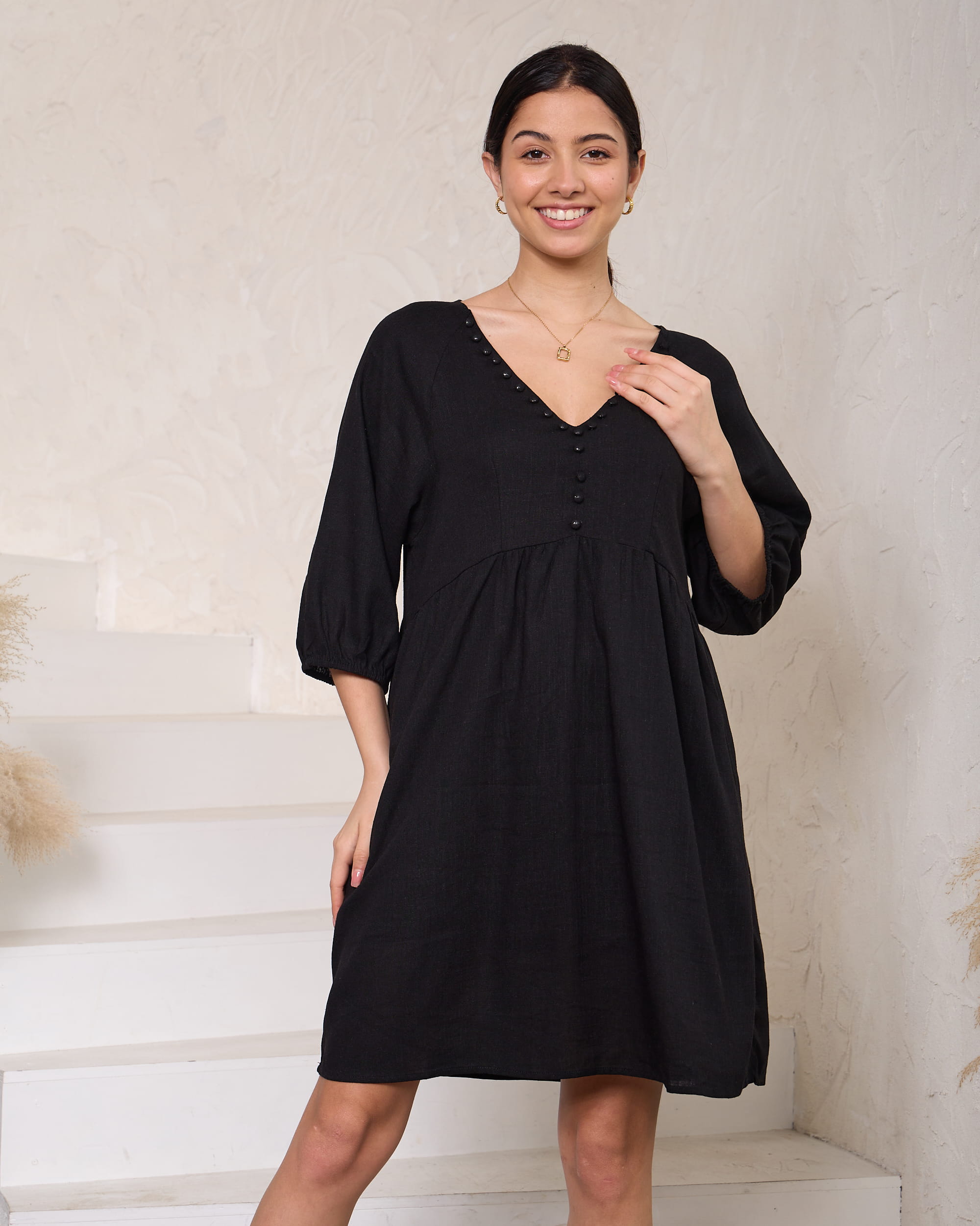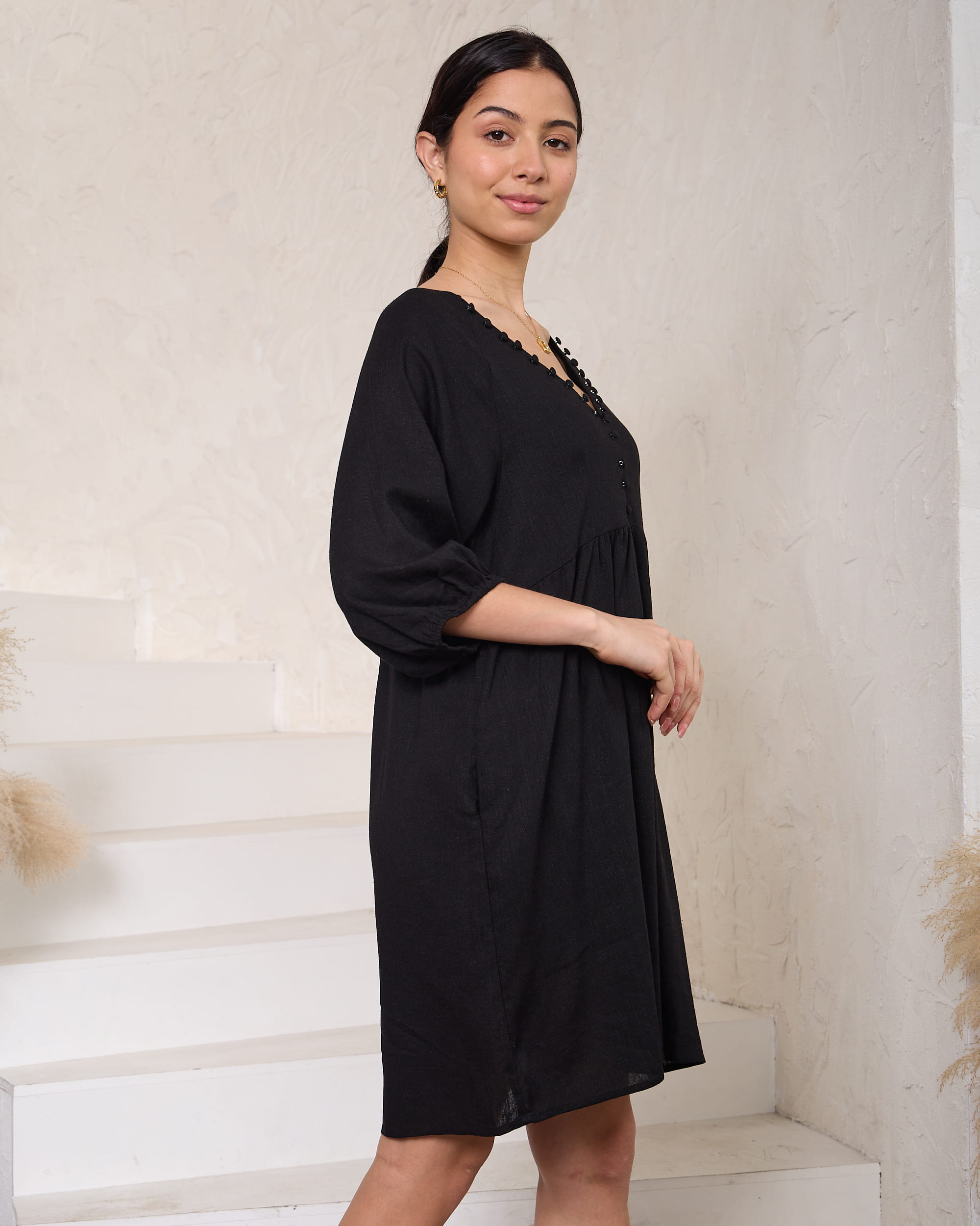 Discover the perfect blend of classic elegance and modern comfort with our Linen Little Black Dress. Crafted from breathable, high-quality linen, this dress features a streamlined silhouette with a flattering fit. The minimalist design includes a subtle V neckline with button details, making it versatile for both casual and formal occasions. Ideal for warm weather, this LBD combines effortless style with the luxurious feel of linen, ensuring you look chic and comfortable from day to night.