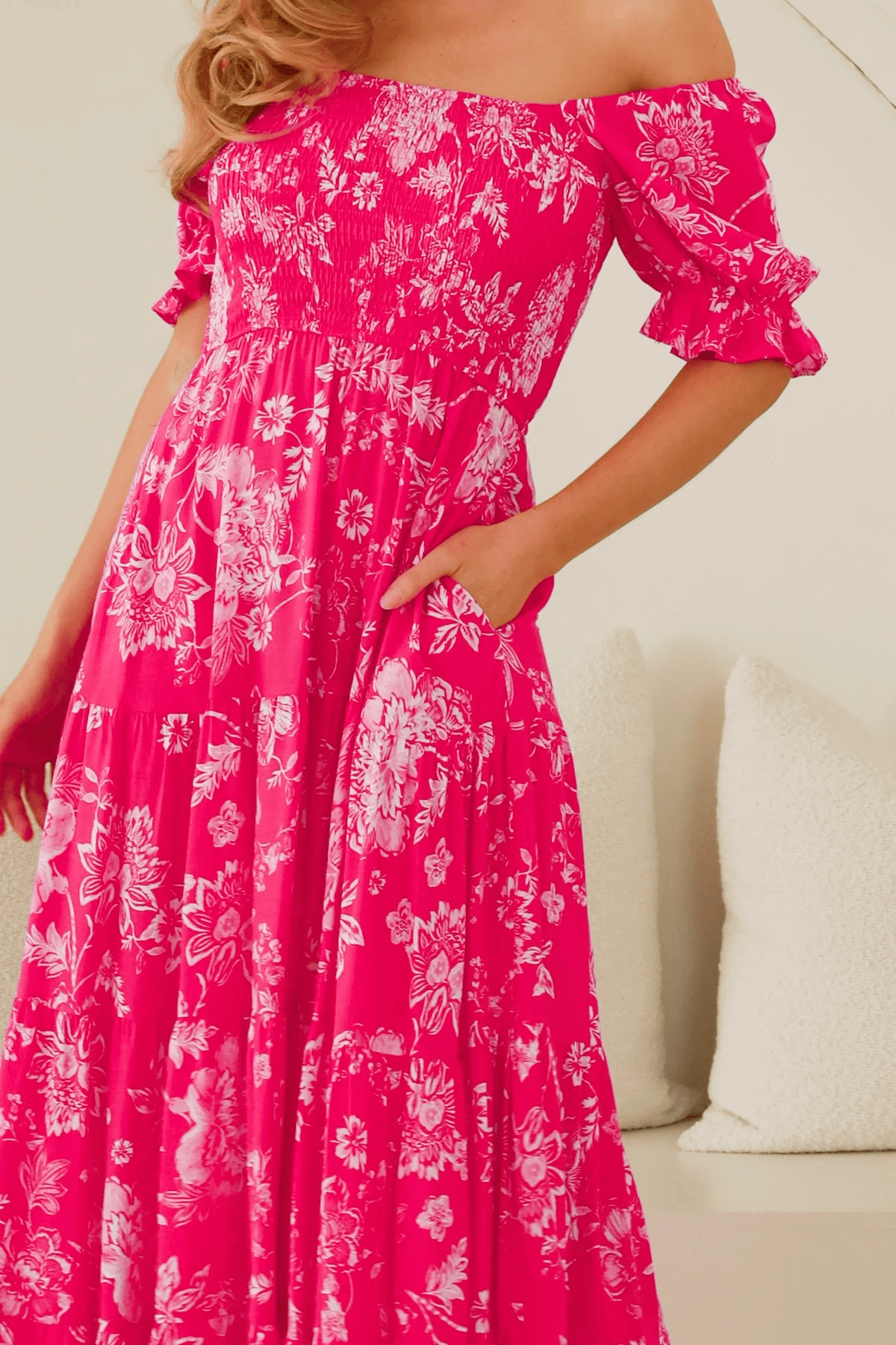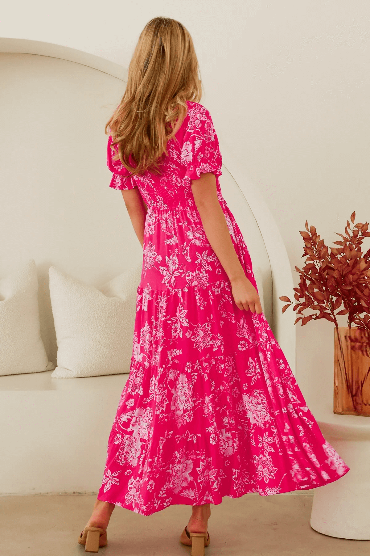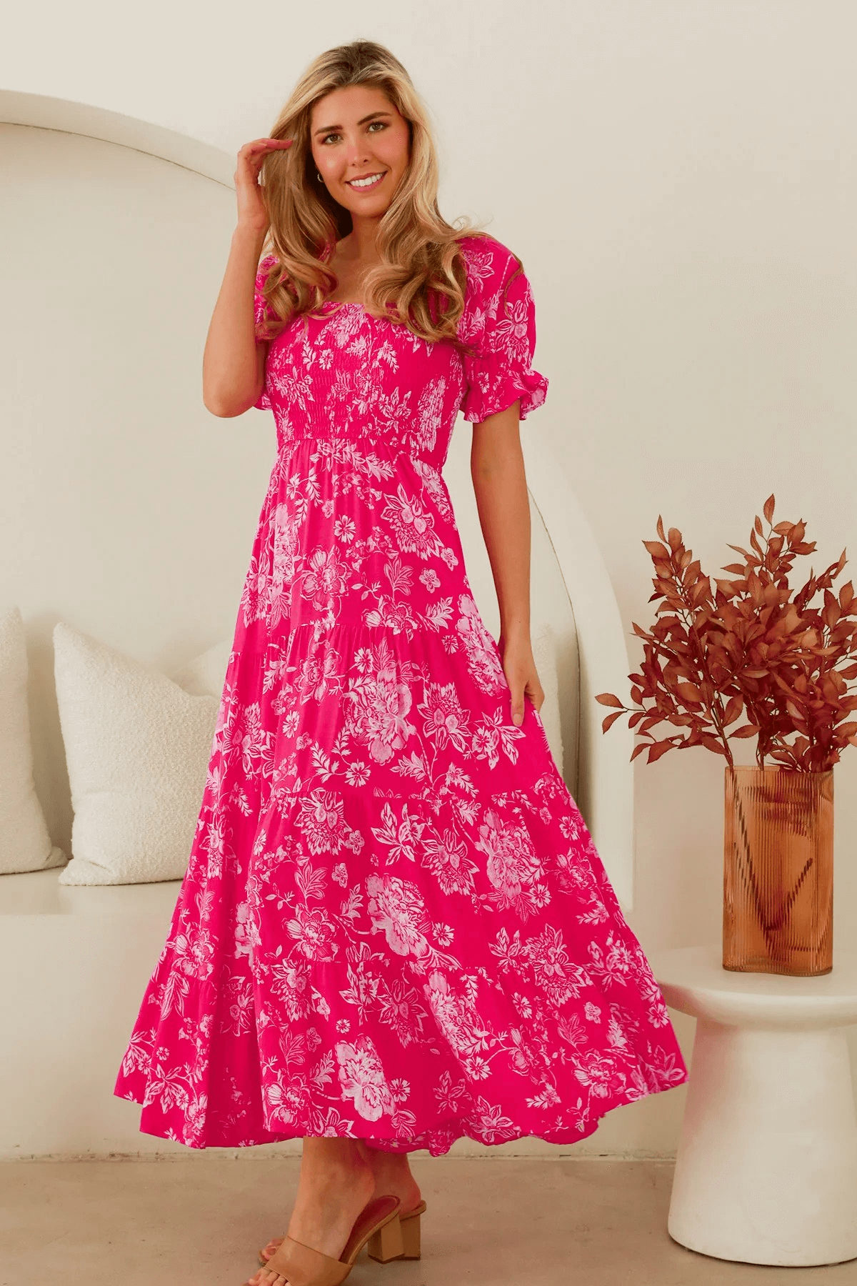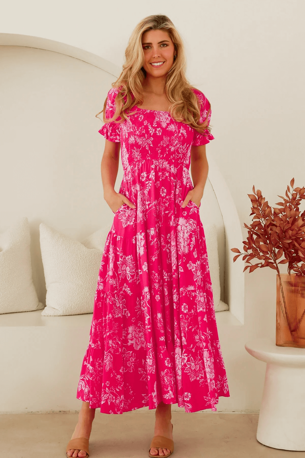 Brighten up your wardrobe with our Petal Pink Dress. Adorned with a vibrant floral print, this dress features a flowing silhouette that effortlessly enhances your style. Crafted from lightweight, breathable fabric, fitted bodice with shirring and a floor-length skirt that moves gracefully. Perfect for casual days or special evenings. Complete your look with sandals or wedges for an effortlessly elegant ensemble.