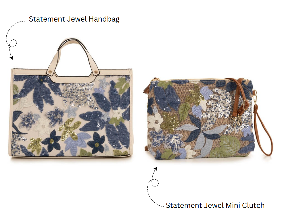 This eye-catching statement handbag is perfect for fashion lovers. Add a touch of sophistication to your outfit with our Statement Jewel Tote, beautifully embroidered with vibrant blue and green flowers.