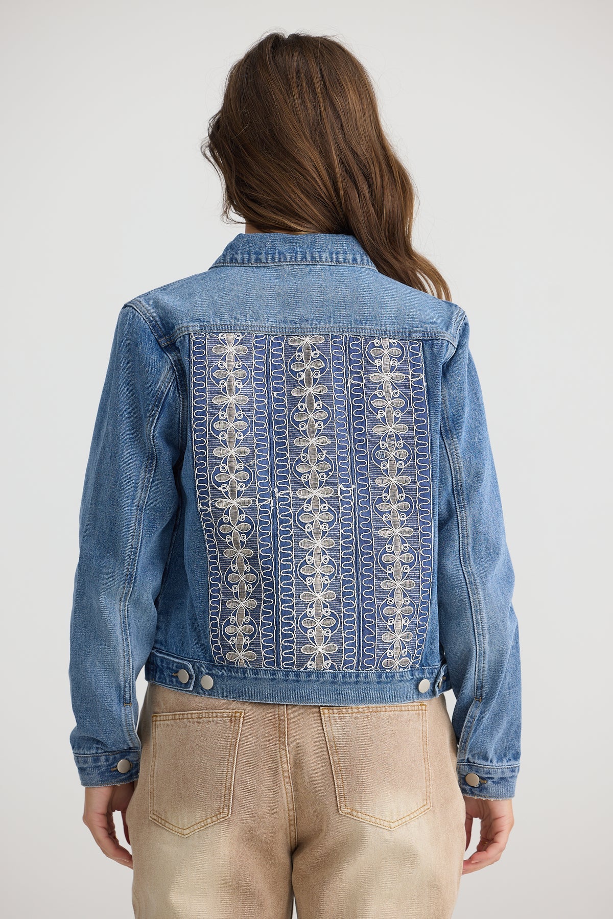Stand out with the Austin Jacket, a timeless classic with a modern twist. With a true statement design on the back panel, this high quality mid blue denim jacket is an elevated classic. Made from high quality durable material, this jacket is the perfect layering piece.