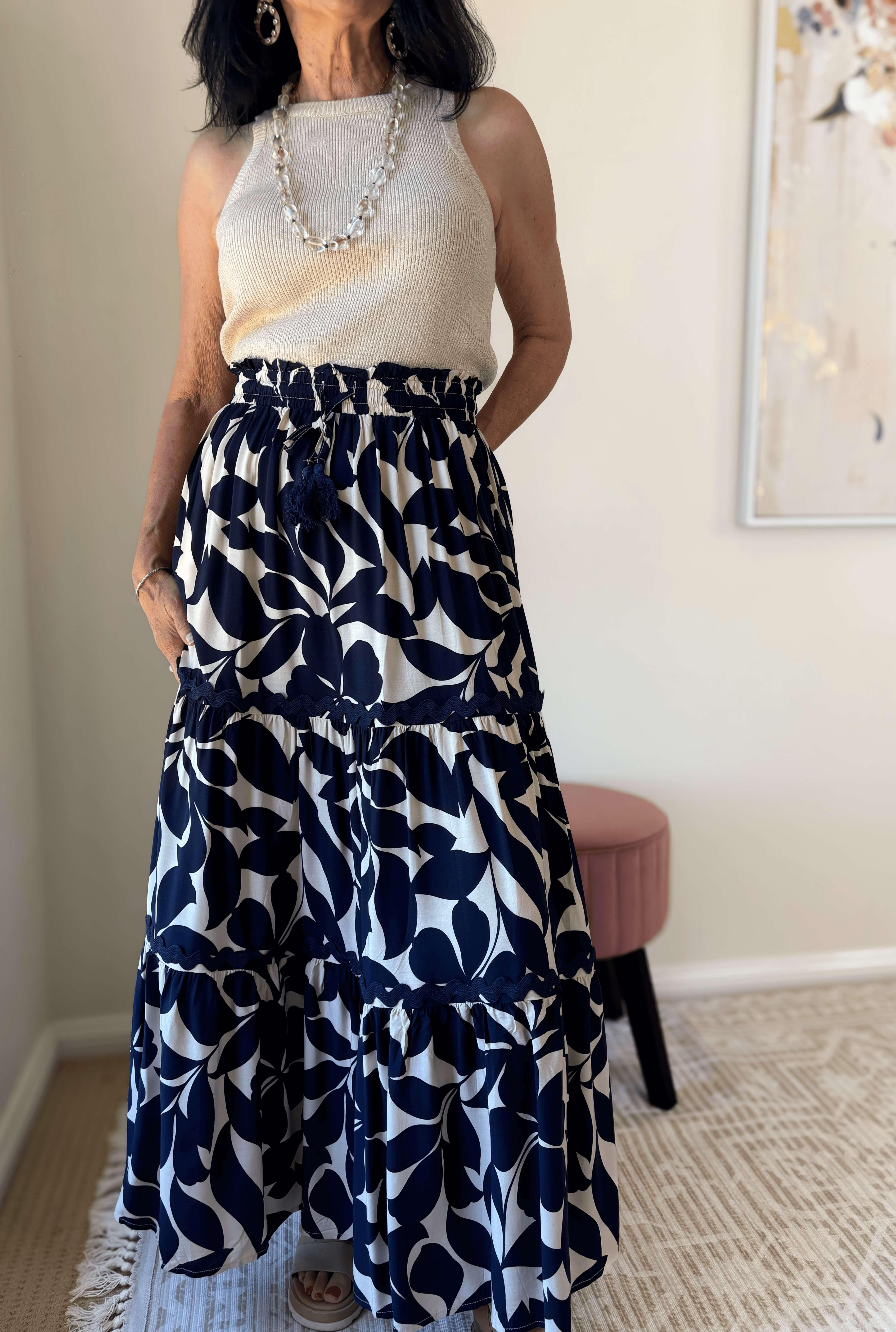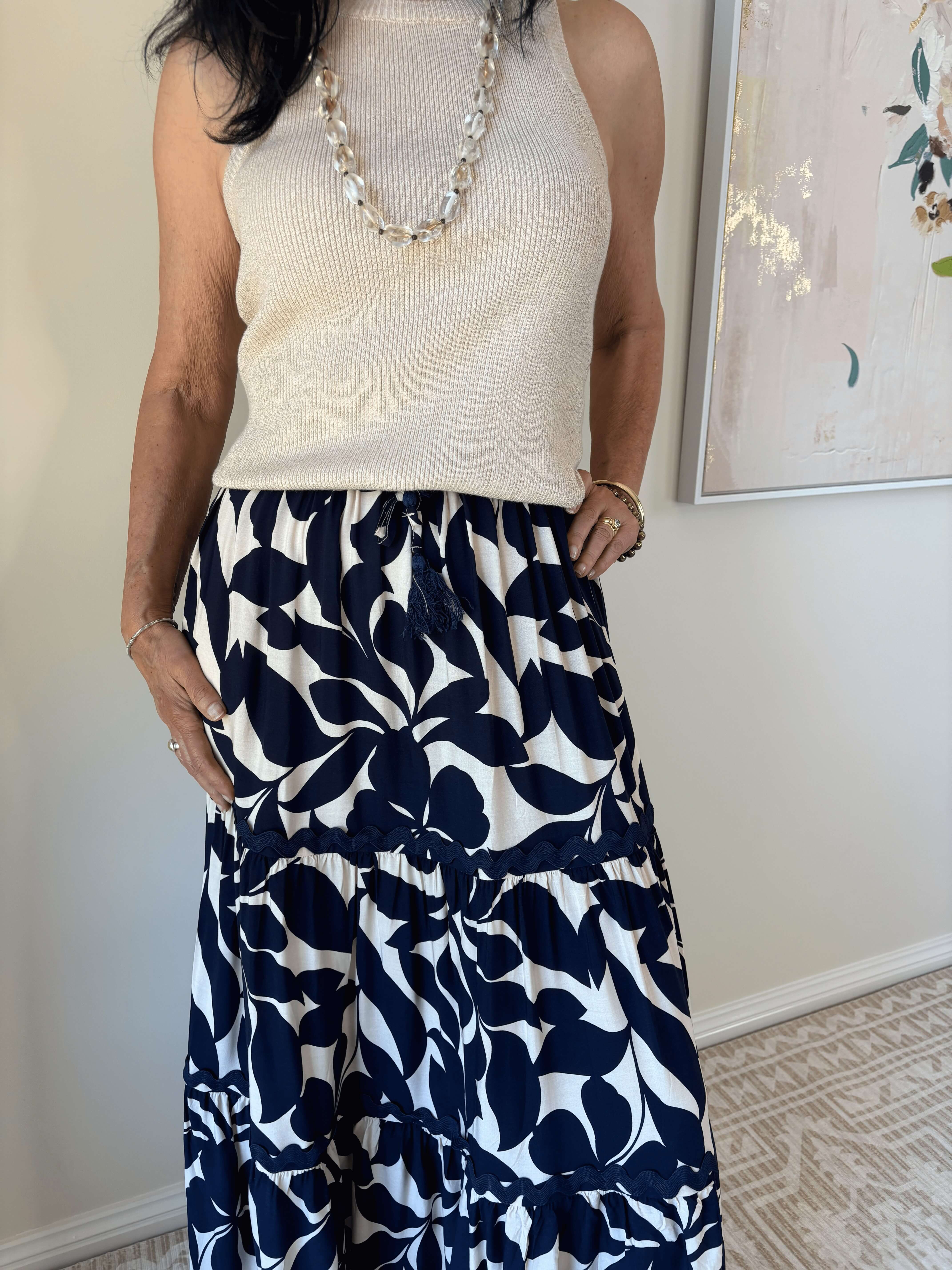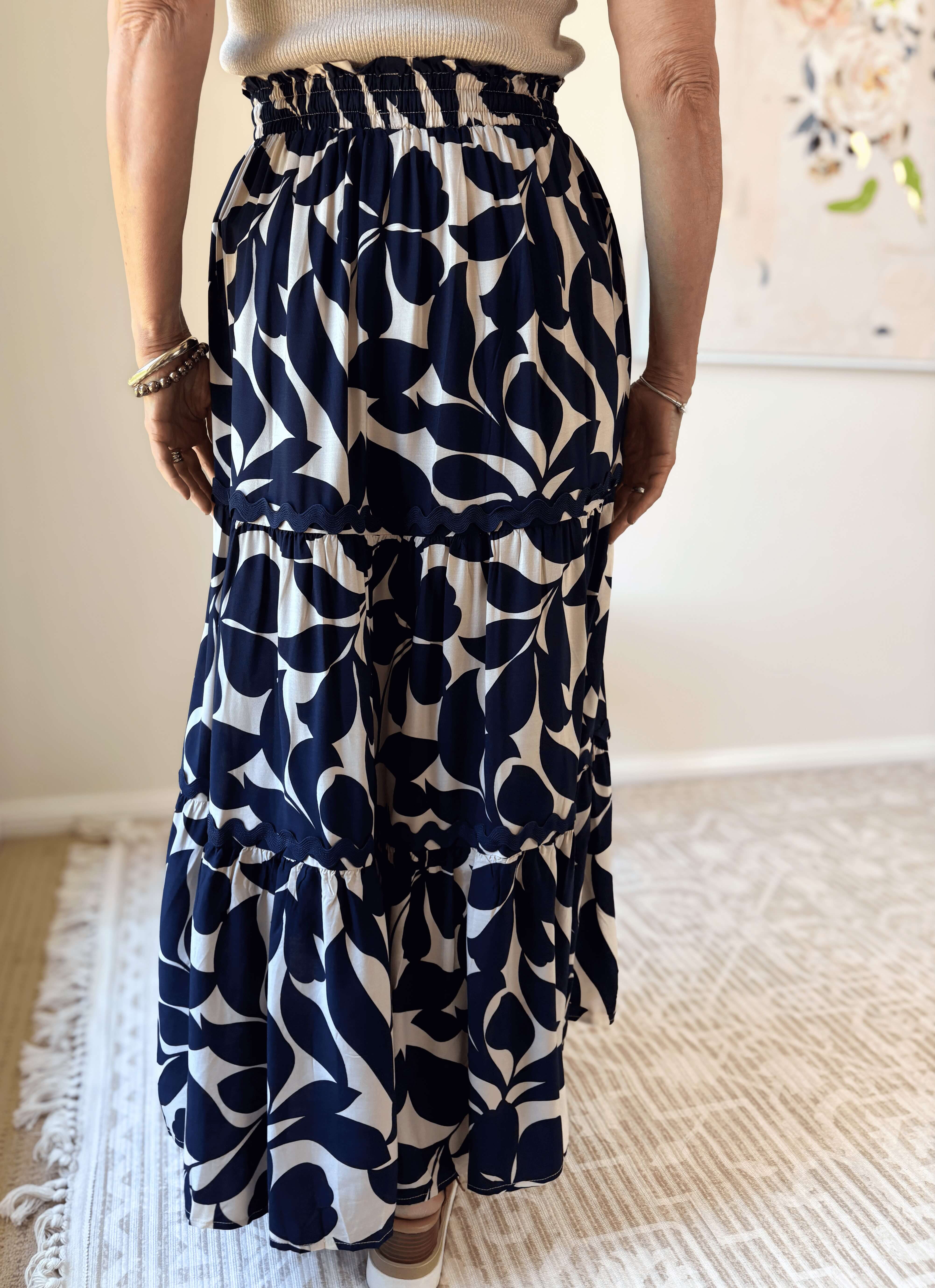 Introducing the Grace Maxi Skirt. Featuring a bold navy print against a cream base, this skirt is a chic statement piece. The elastic waistband and drawstring allow for all-day comfort and adjustability, while the Ric Rac design feature will have you in love with the sweet charm to express your inner femininity.