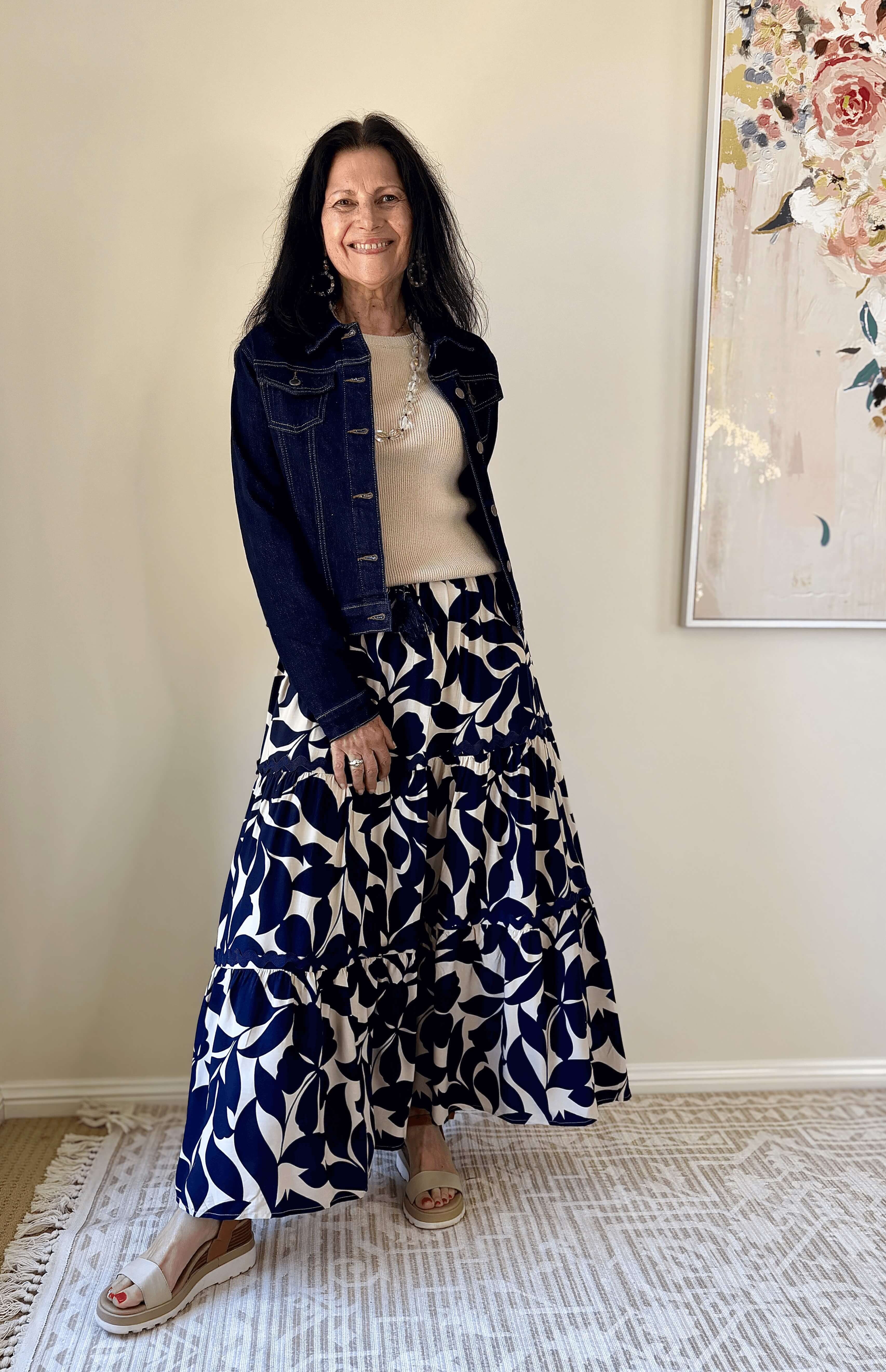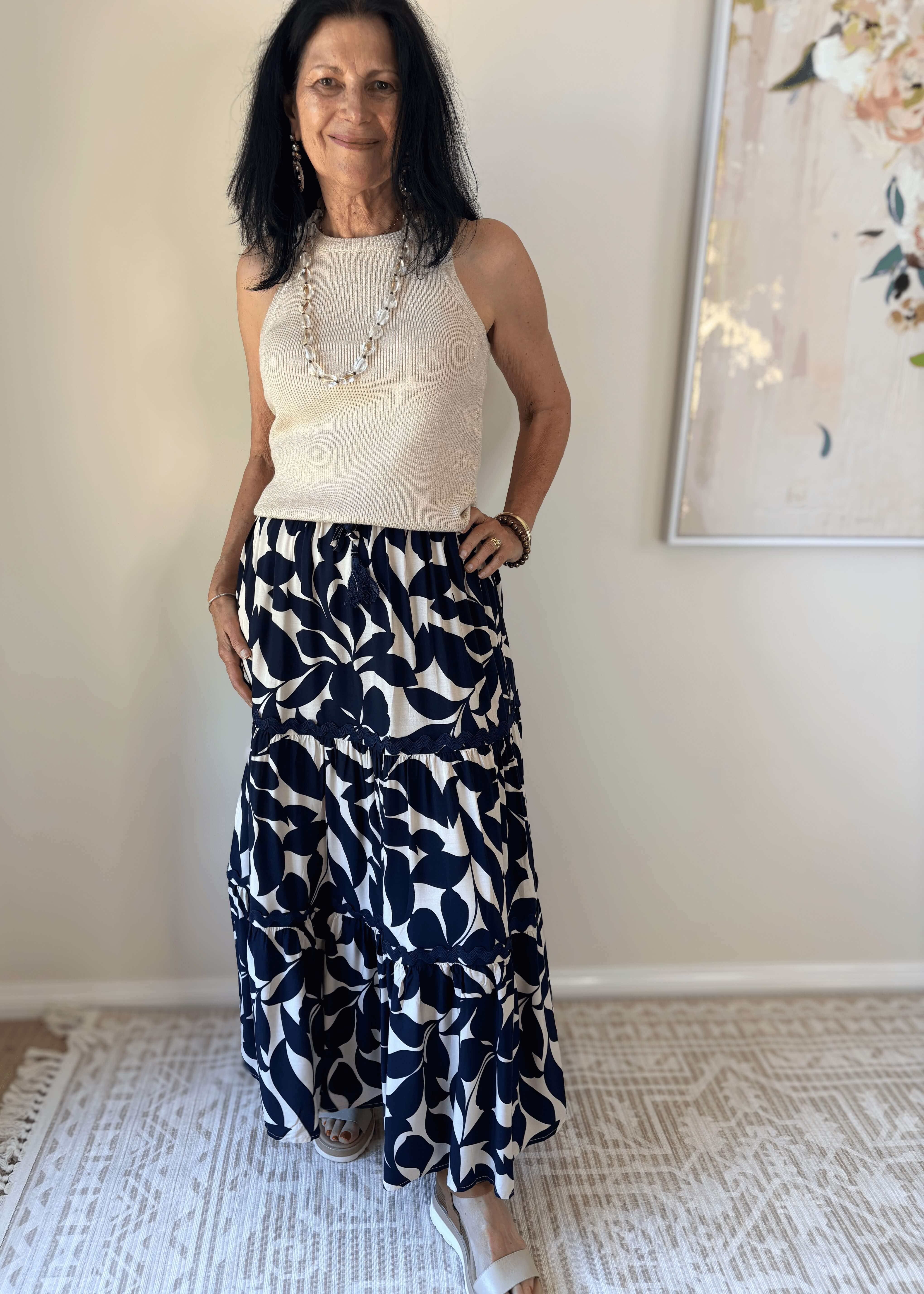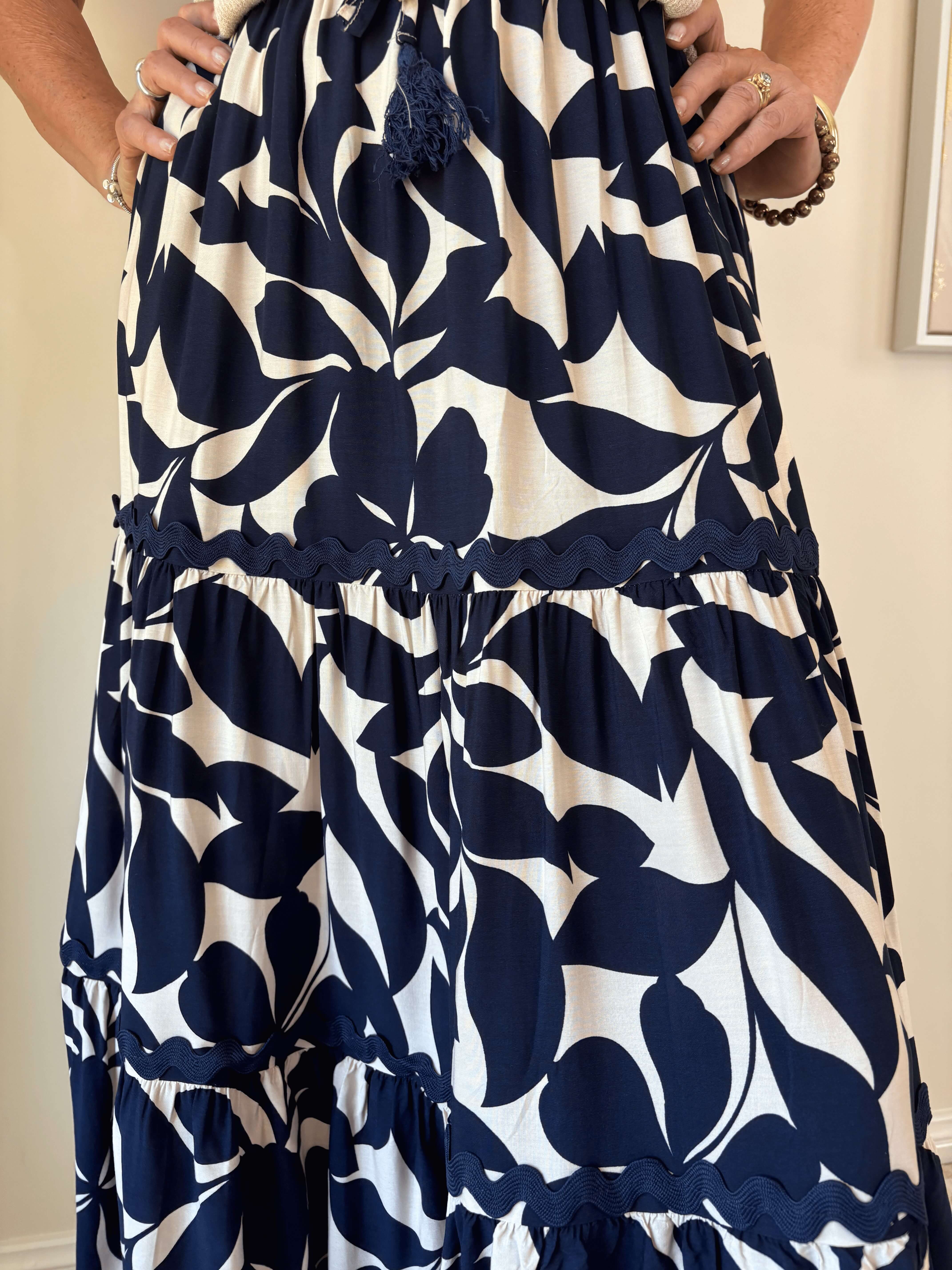 Introducing the Grace Maxi Skirt. Featuring a bold navy print against a cream base, this skirt is a chic statement piece. The elastic waistband and drawstring allow for all-day comfort and adjustability, while the Ric Rac design feature will have you in love with the sweet charm to express your inner femininity.